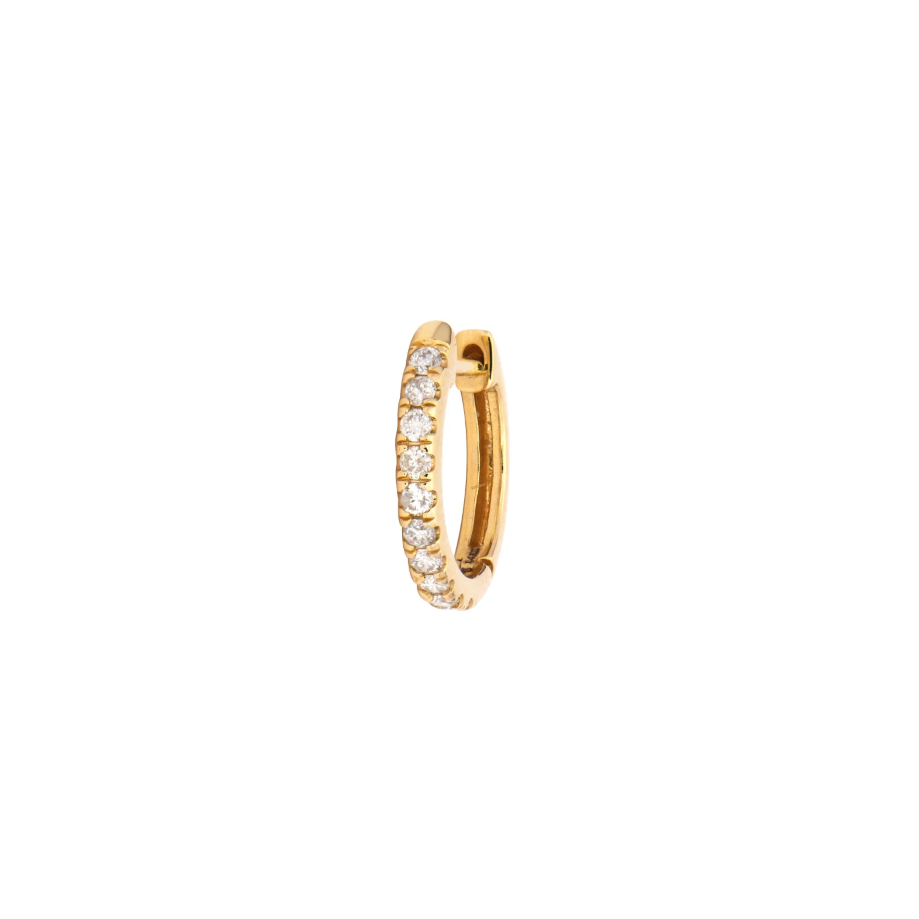 Classic Diamond Huggie Hoop Earring from Three Stories Jewelry is made from 14k yellow gold with .12ct sparkling round diamonds in a pave setting. Measures 12mm.