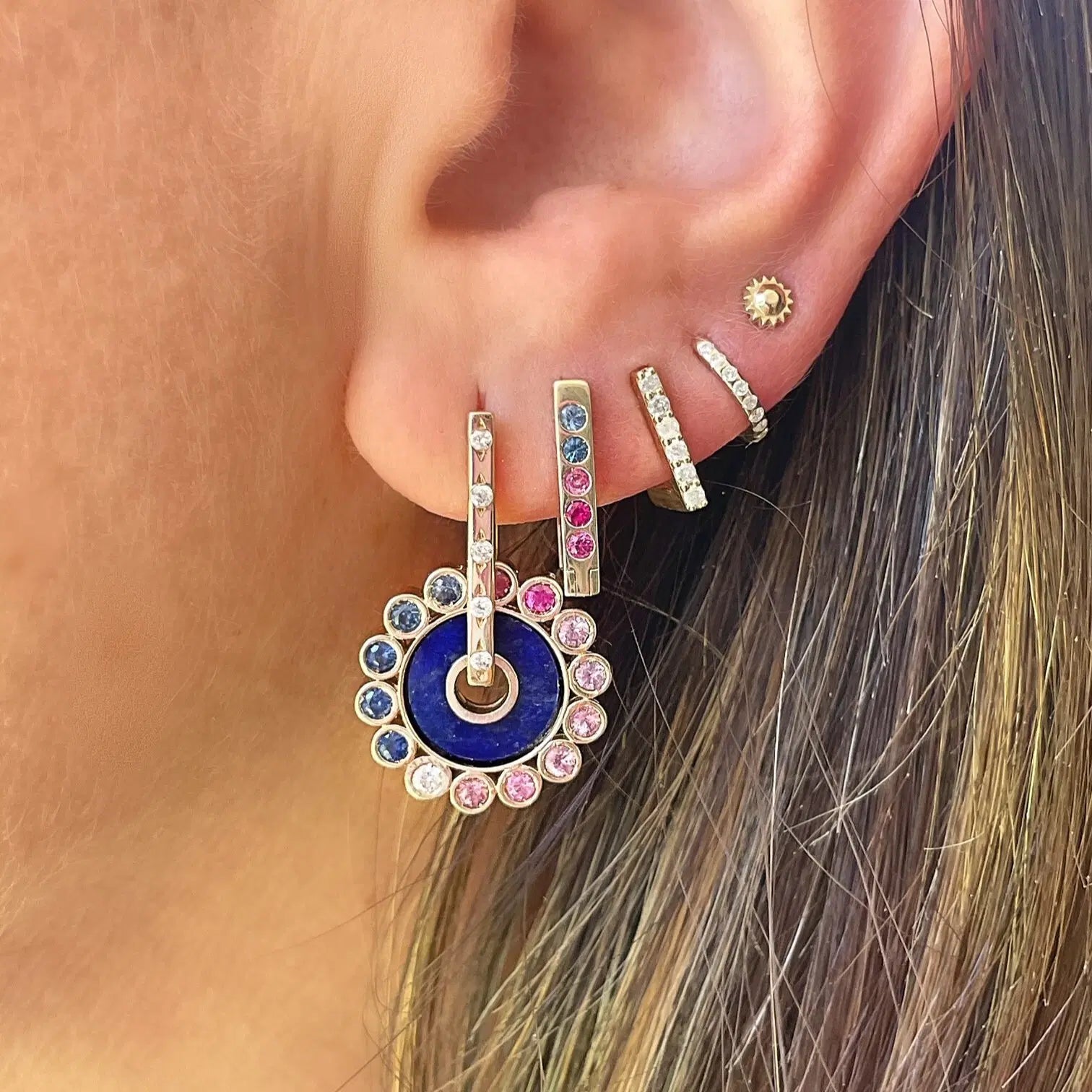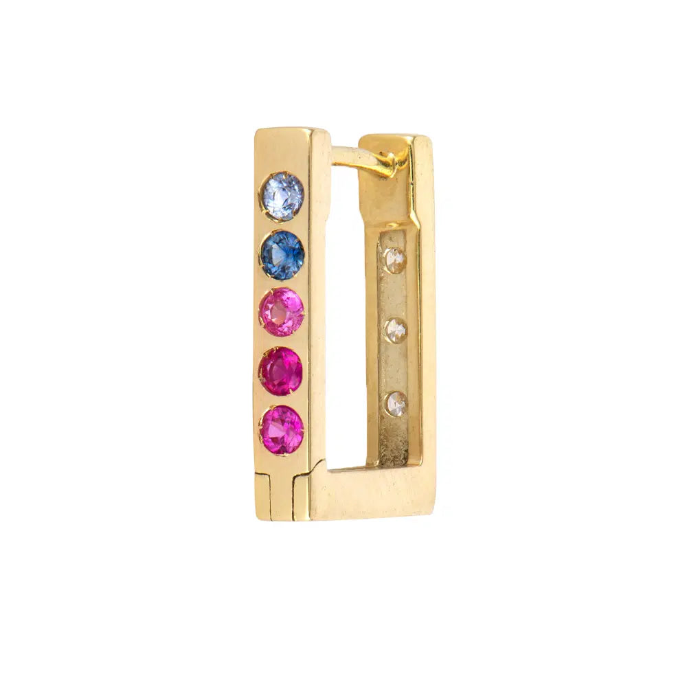 Three Stories Jewelry 14k yellow gold Ombre Sapphire and Diamond Classic Double Sided Small Rectangular Hoops showcase metal set round ombre sapphires on the front side of the rectangular hoop and metal set round diamonds on the back.