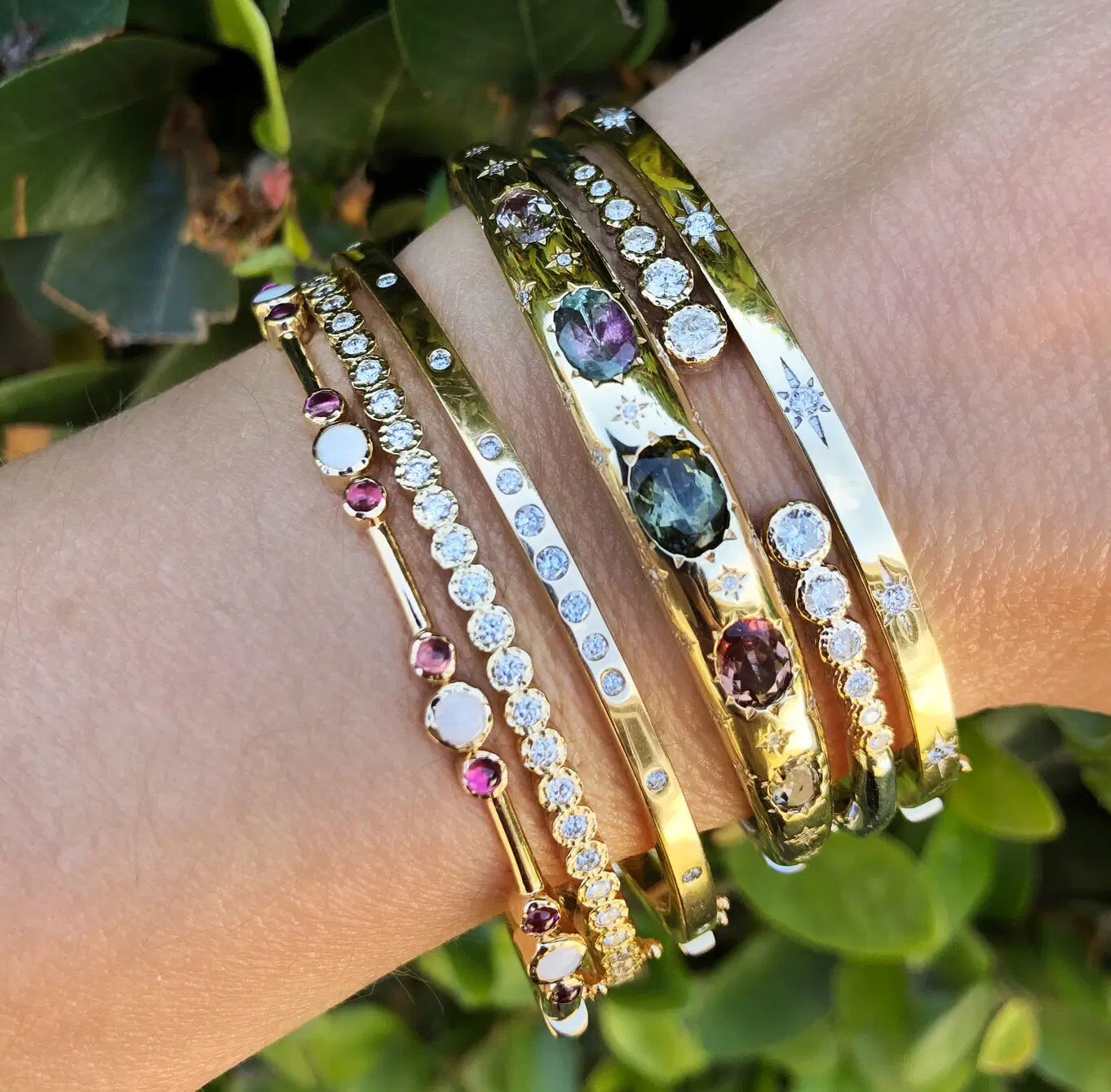 Three Stories Jewelry Timeless Graduated Diamond Bangle bracelet features metal set sparkling round diamonds on the front and back of the bangle in14K yellow gold with a stunning high polish finish