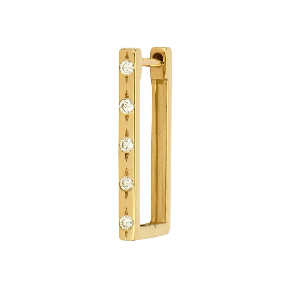 Rectangular hoop earring feature metal set diamonds in 14k yellow gold with starburst accents.