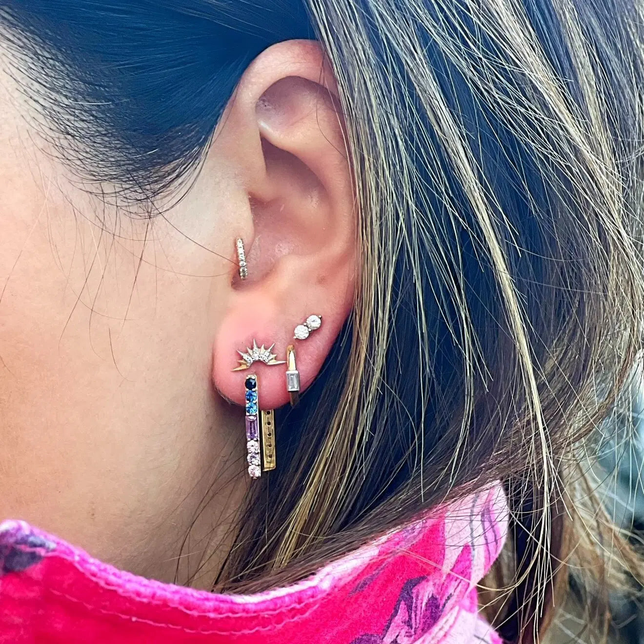 Three Stories Jewelry 14k yellow gold Ombre Sapphire and Diamond Two-Sided Rectangular Hoop Earring showcase pave round and baguette ombre sapphires on the front side of the rectangular hoop and pave round diamonds on the back.