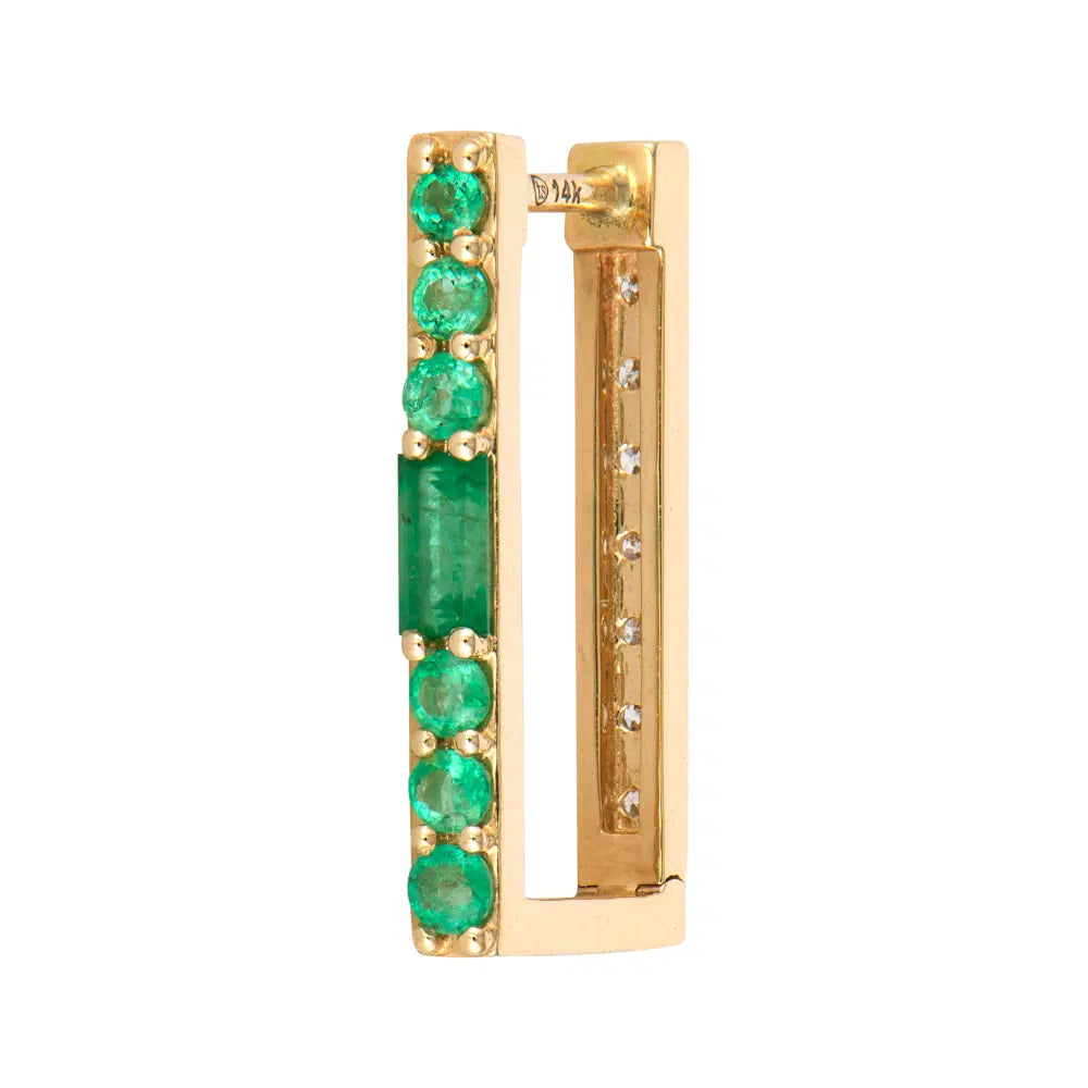Three Stories Jewelry 14k yellow gold Emerald and Diamond Two-Sided Rectangular Hoop showcase pave round and baguette emeralds on the front side of the rectangular hoop and pave round diamonds on the back.